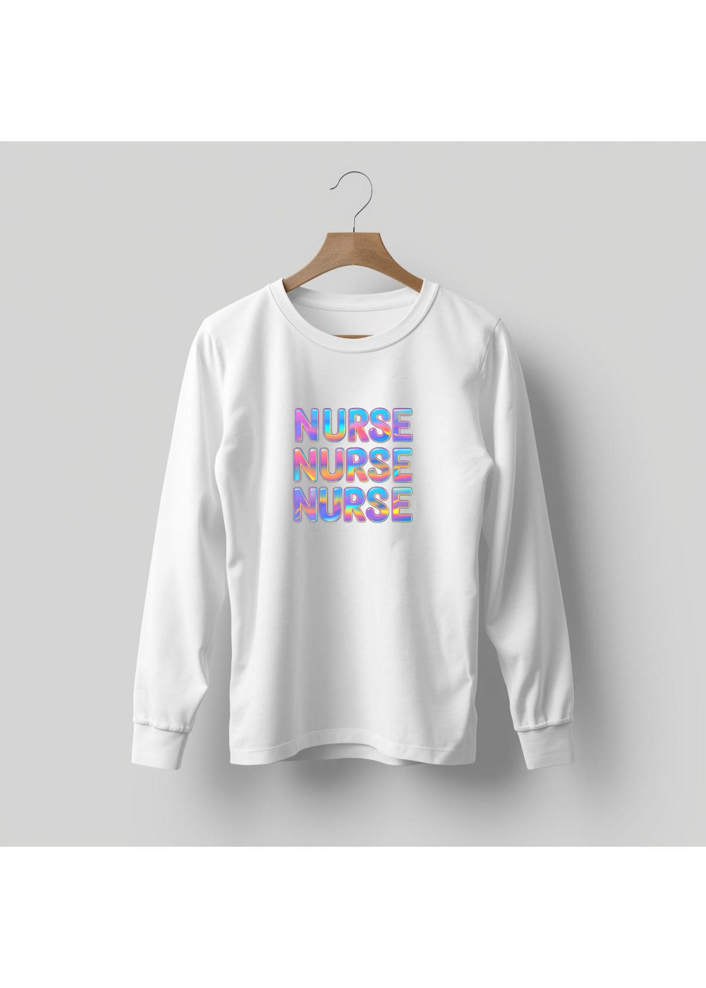 Show off your nurse pride in a fun, colorful way with the Triple Nurse Retro Glow design. This eye-catching graphic features “NURSE” stacked three times in a bold retro font with a bright pastel shimmer that pops beautifully on both light and dark apparel. It has a playful, trendy look that still feels easy to wear every day.